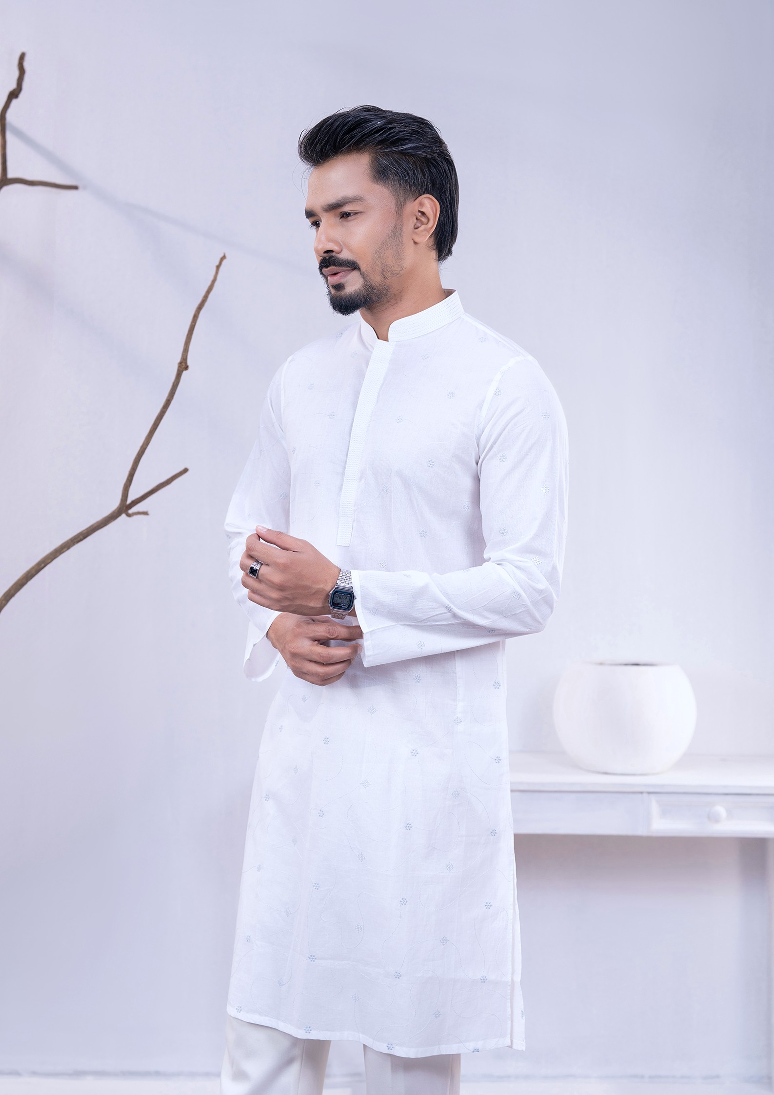 - Premium 100% cotton men’s panjabi in classic white with embroidery