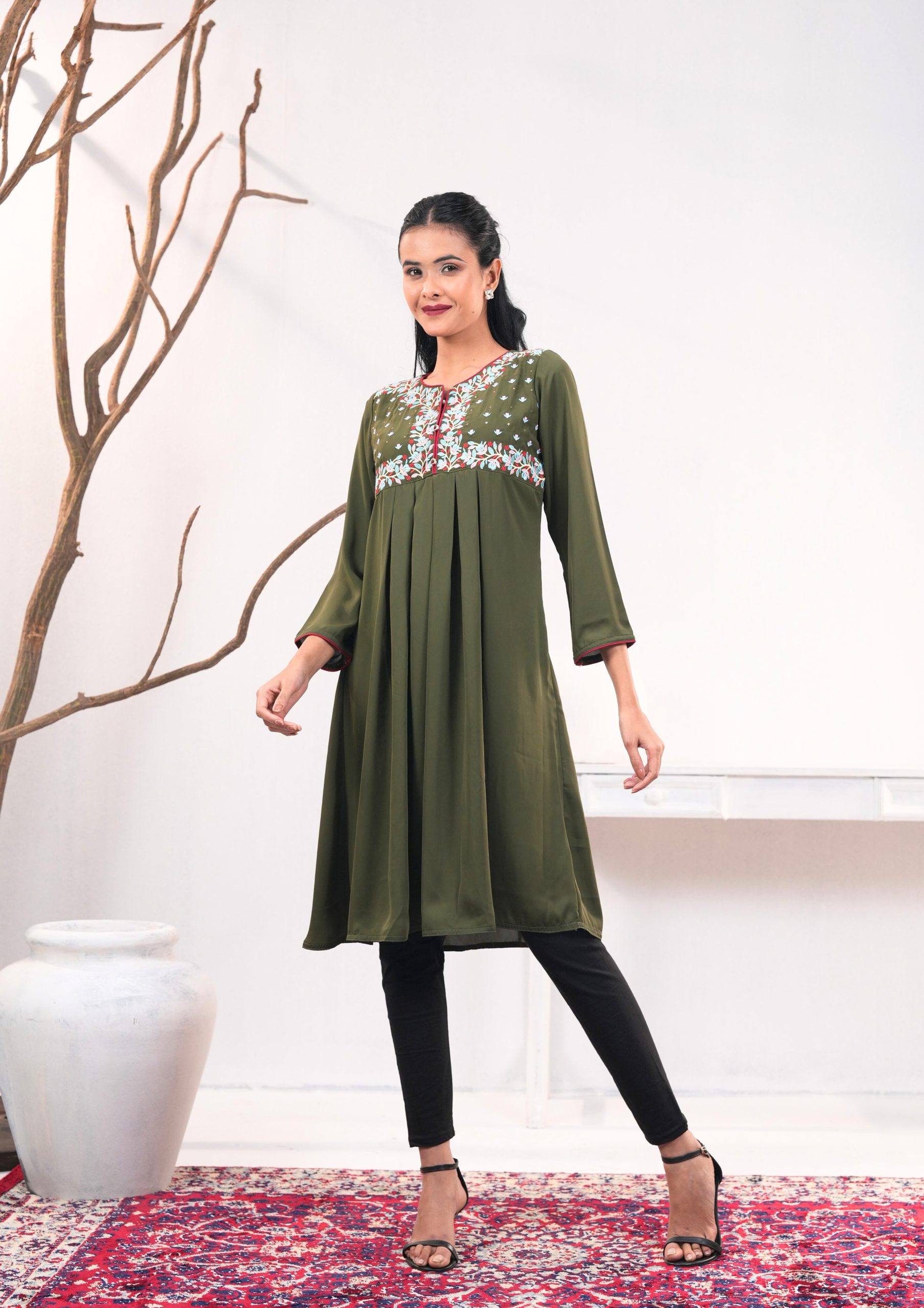 - Premium cherry georgette ethnic kurti in a rich Chalet Green shade