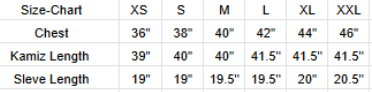 | Size Chart | Chest | Tops Long | Kamiz Long | Full Sleeve | Quarter Sleeve | Pant Long |
