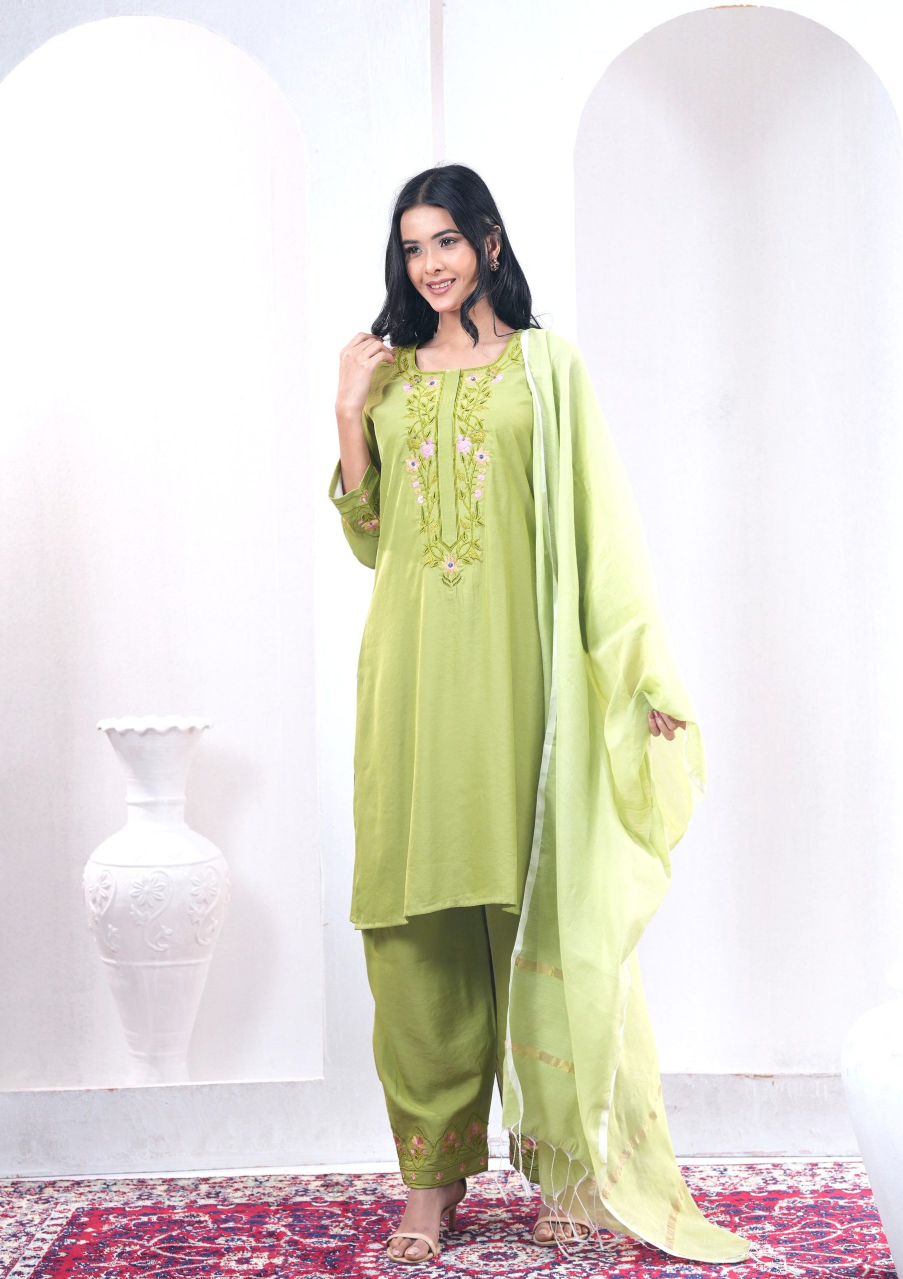 - Dubai silk Kamiz & Pant with half-silk Dupatta in rich forest green