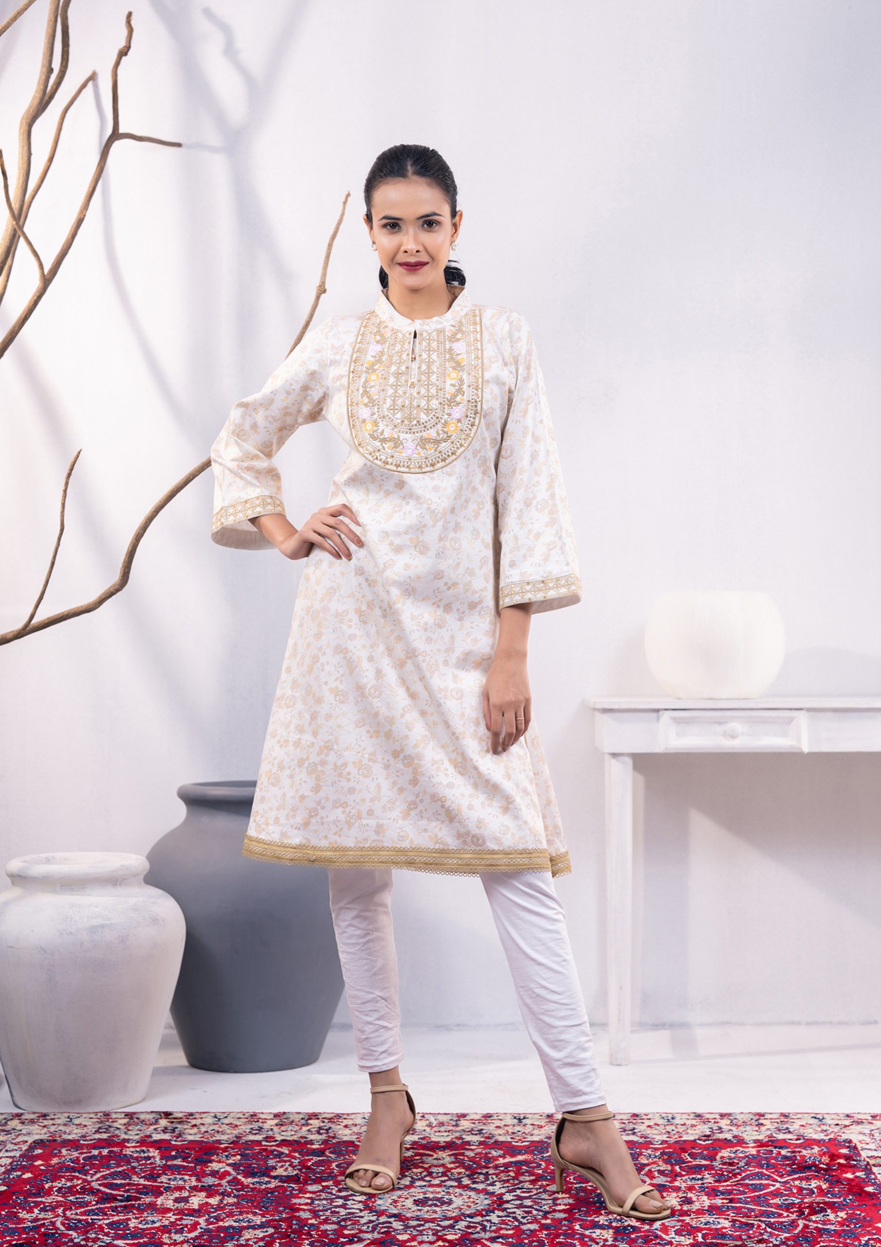 | Design Details | Tonal sequin-embellished yoke with embroidered circular hem, this women’s ethnic one-piece tunic has a length that falls under the knee. |