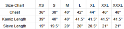 | Size Chart | Chest | Tops Long | Kamiz Long | Full Sleeve | Quarter Sleeve | Pant Long |