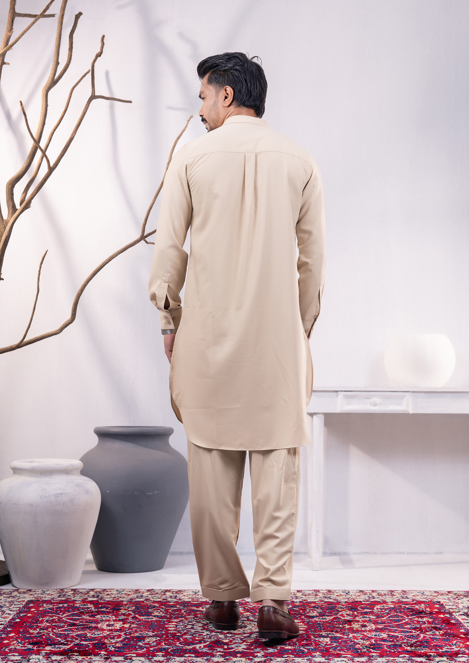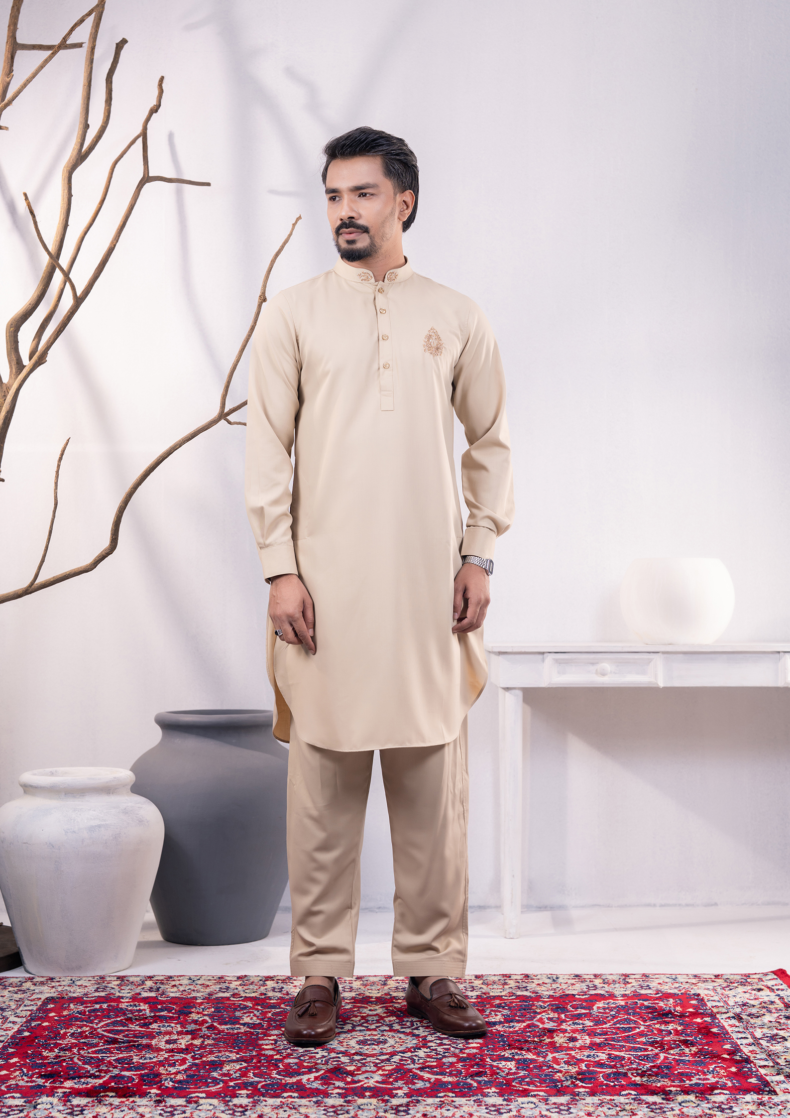 | Design Details | Karchupi embellished round hem classic men’s kabli set. |