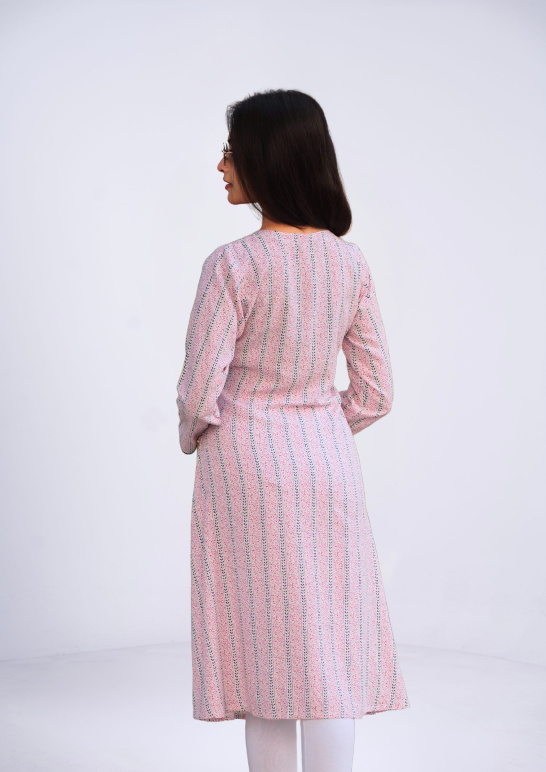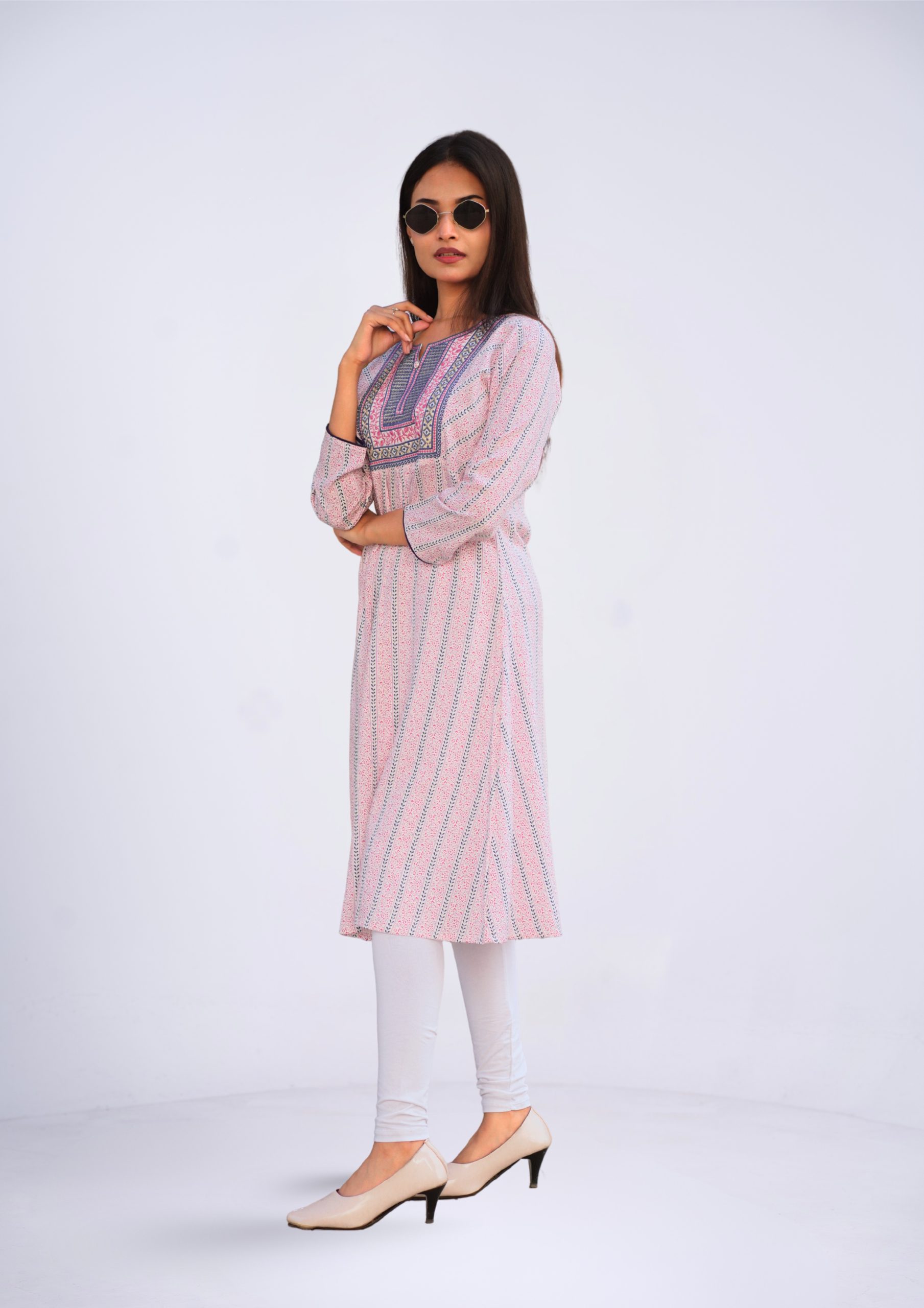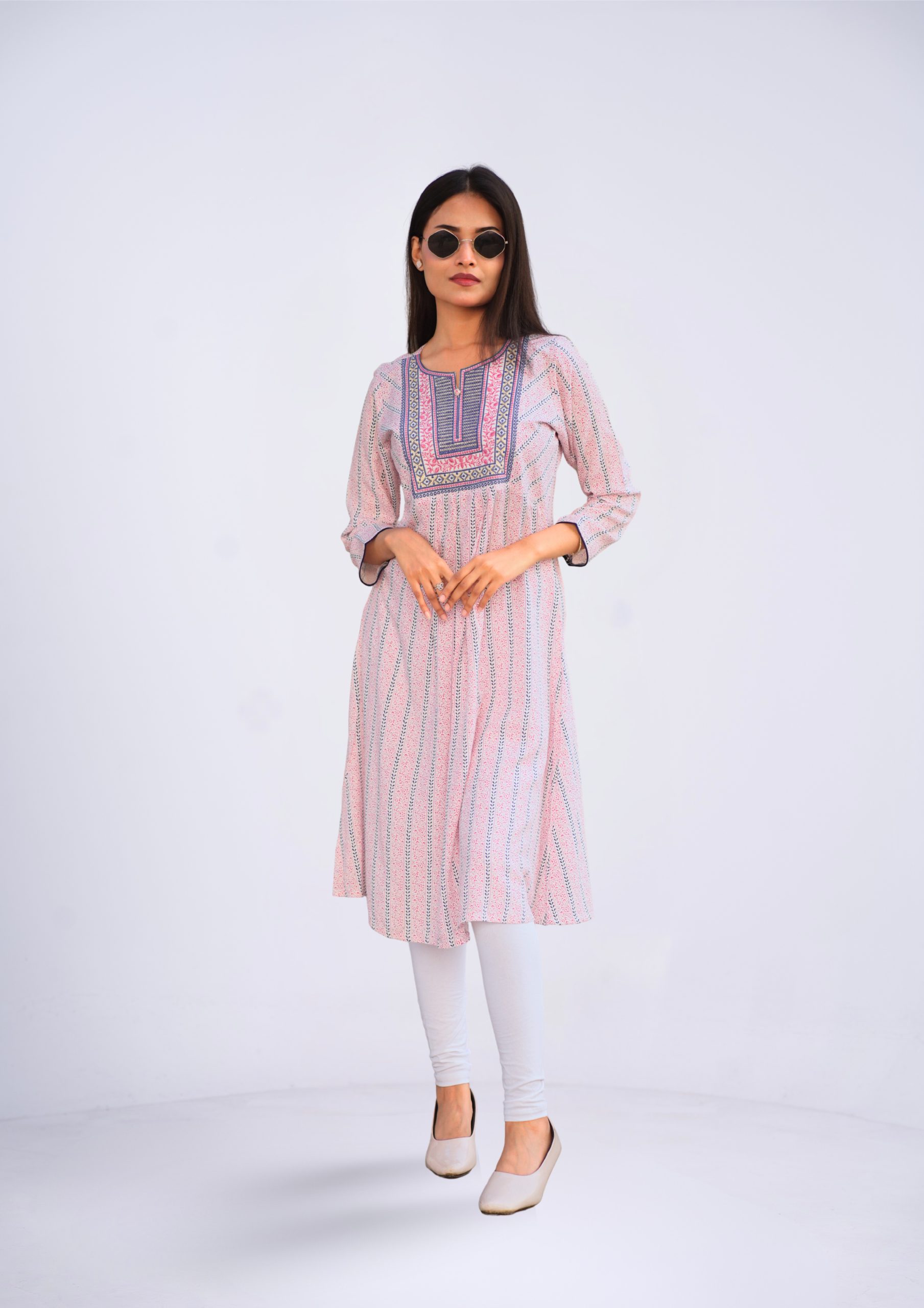 | Design Details | Tonal embroidery yoke with stripe printed under knee, length women’s one piece ethnical kurti. |