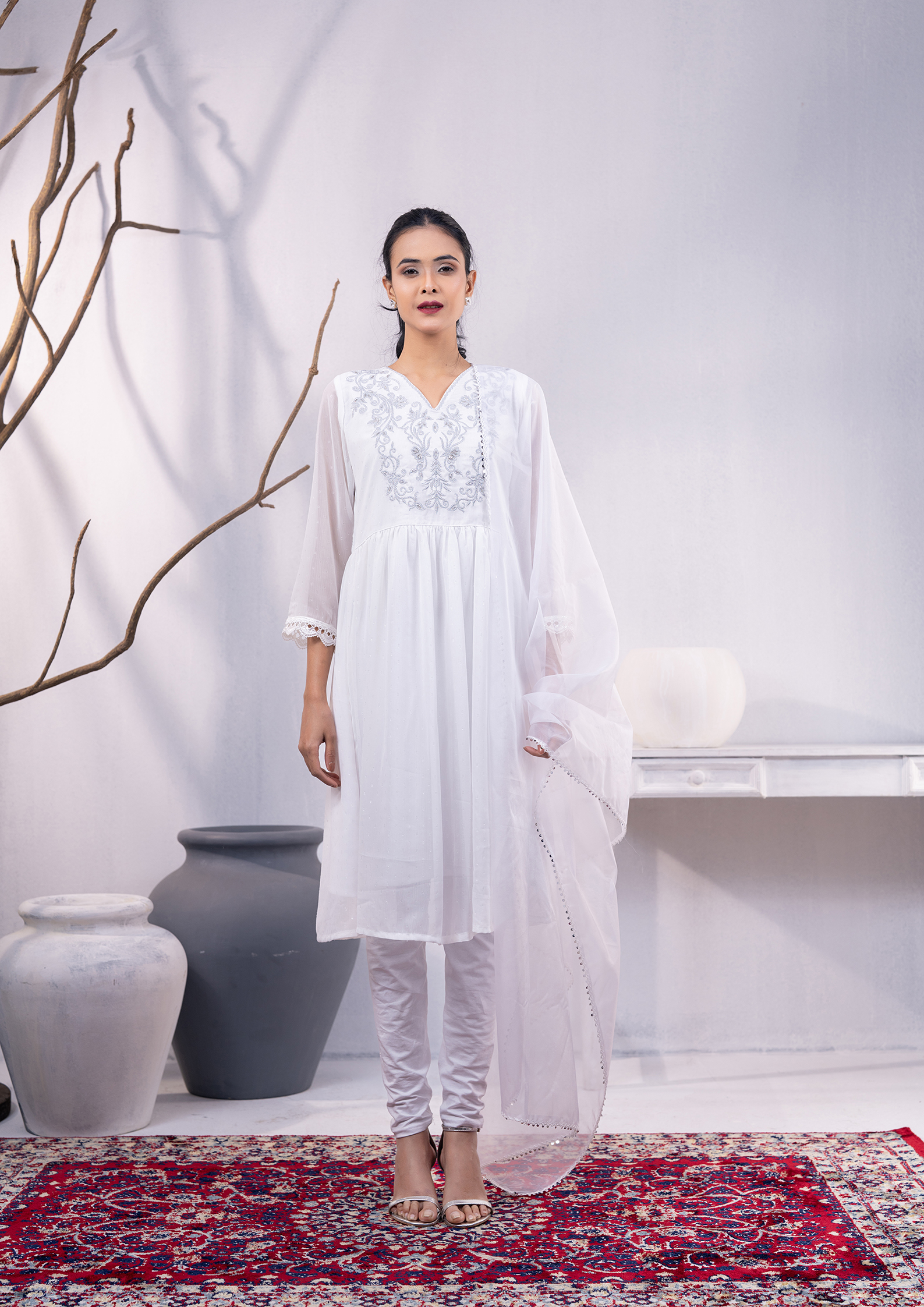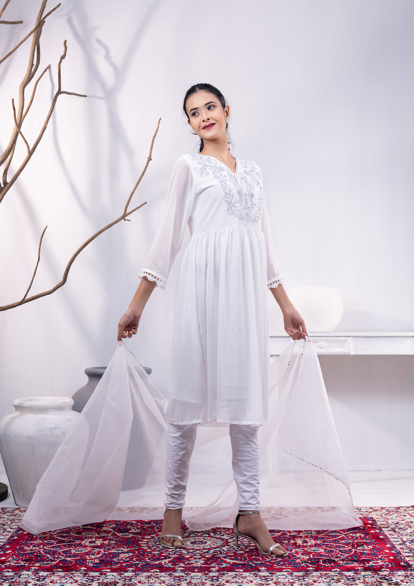 - Elegant white 2-piece round-hem gown set crafted with georgette top and sheer organza dupatta