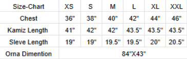 | Size Chart | Chest | Tops Long | Kamiz Long | Full Sleeve | Quarter Sleeve | Pant Long |