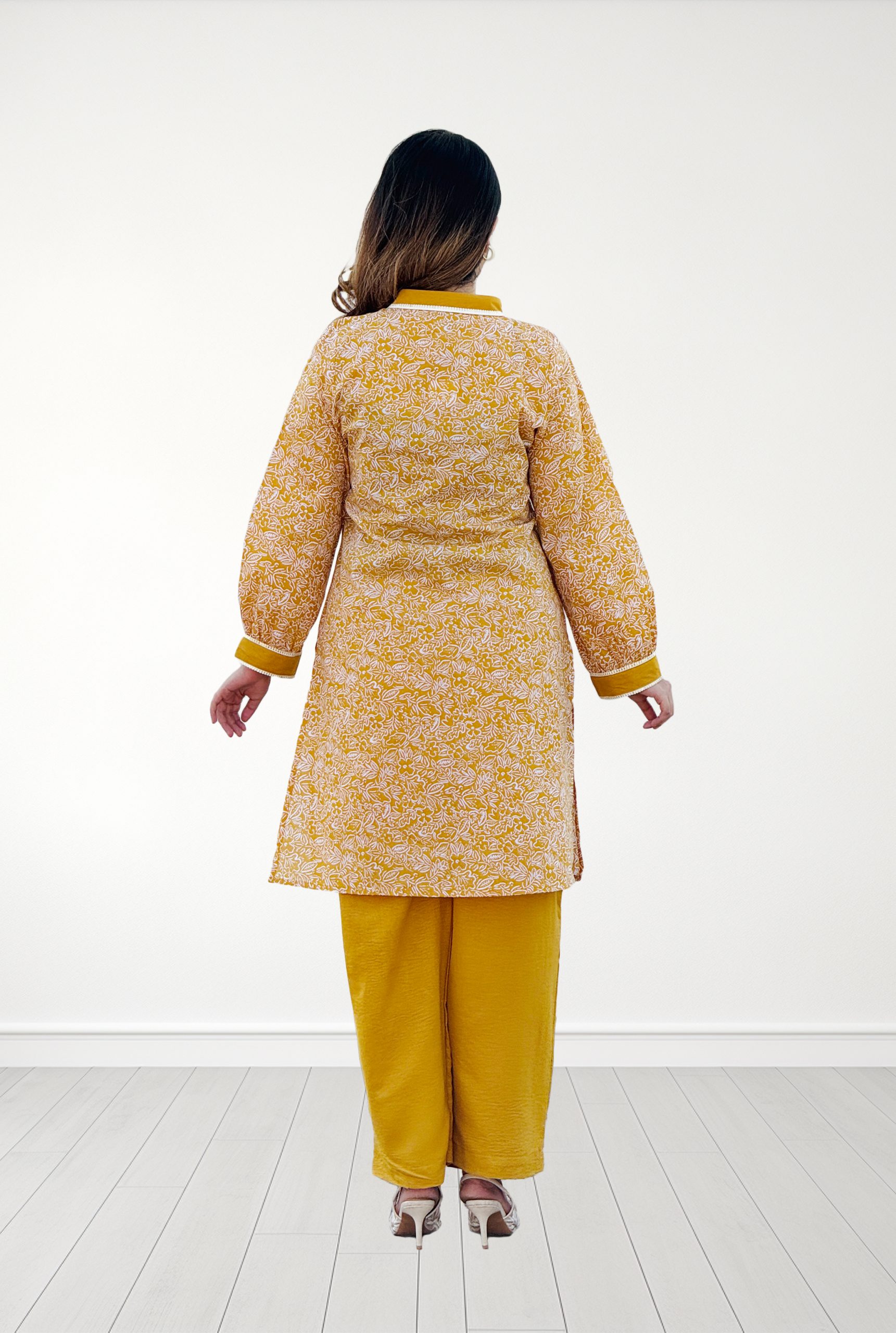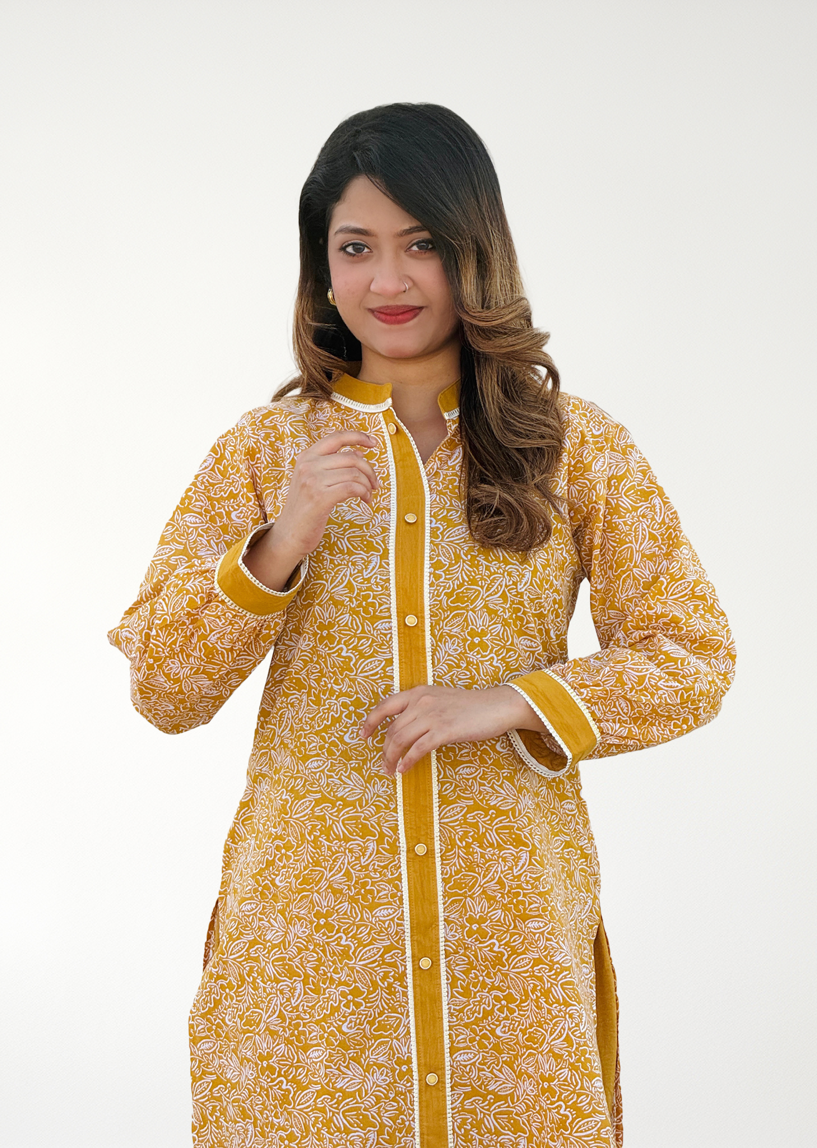 #Regular Fit with mandarin collar, side cut , full sleeve with cuff and lace work.